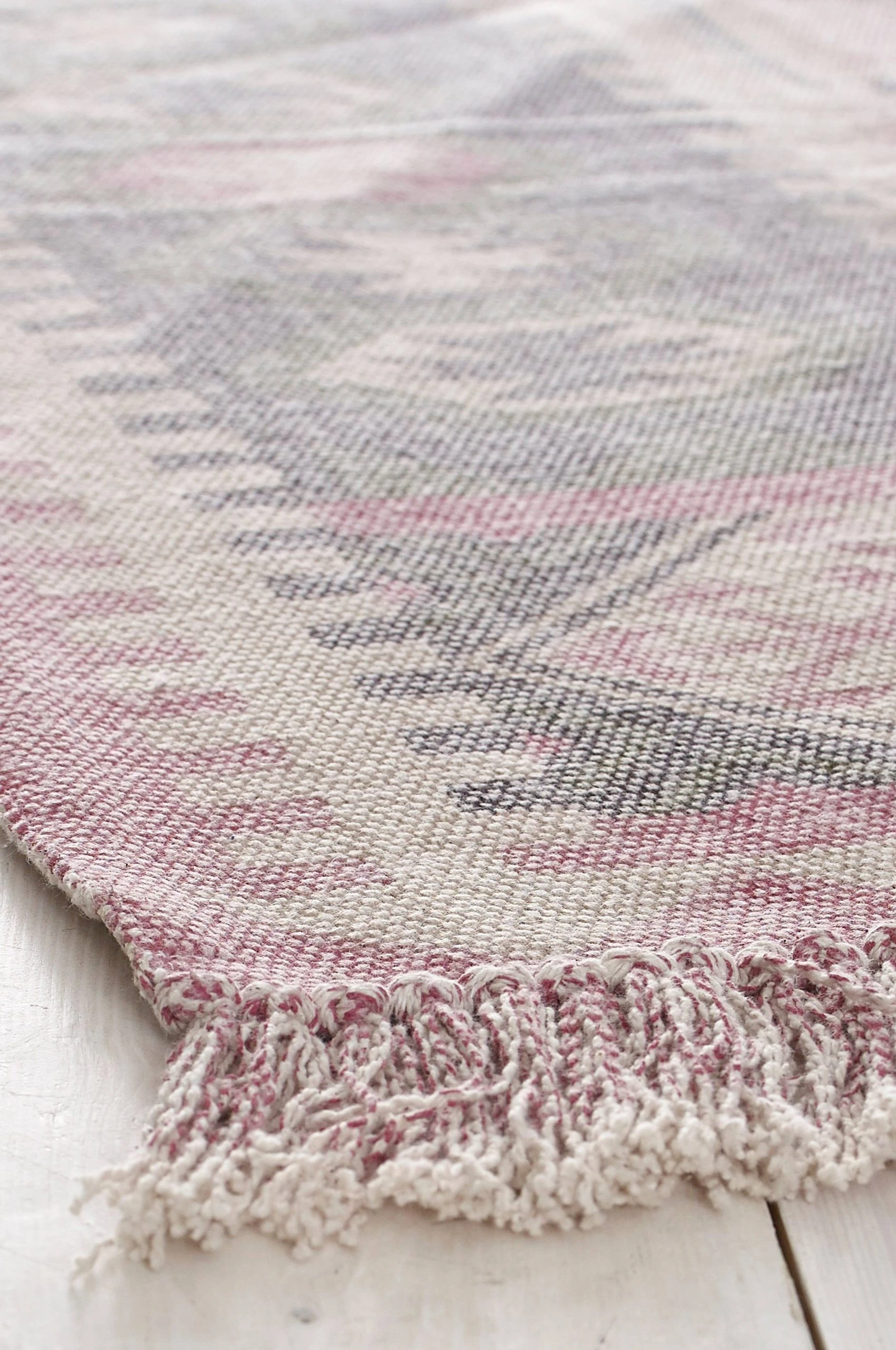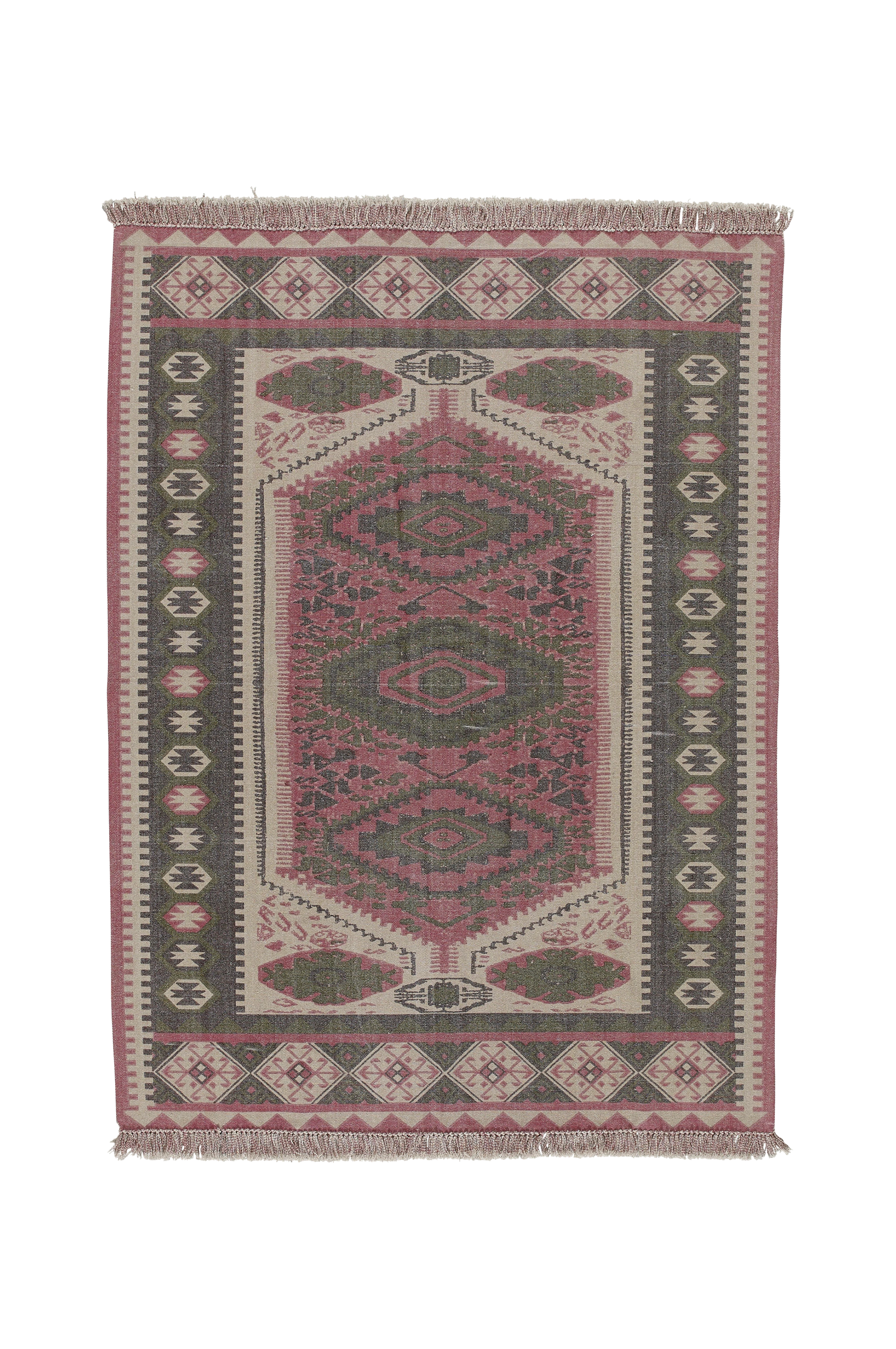 Vävd bomullsmatta i tvättad kvalitet med tryckt mönster. Fransar längs kortsidorna som även de är mönstrade. Mattan finns i två storlekar, 140×200 och 170×240 cm.