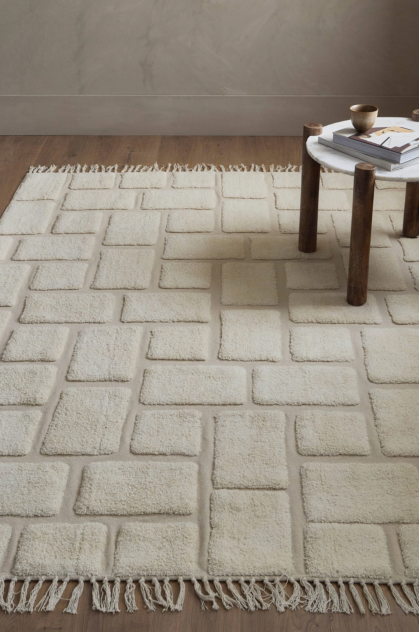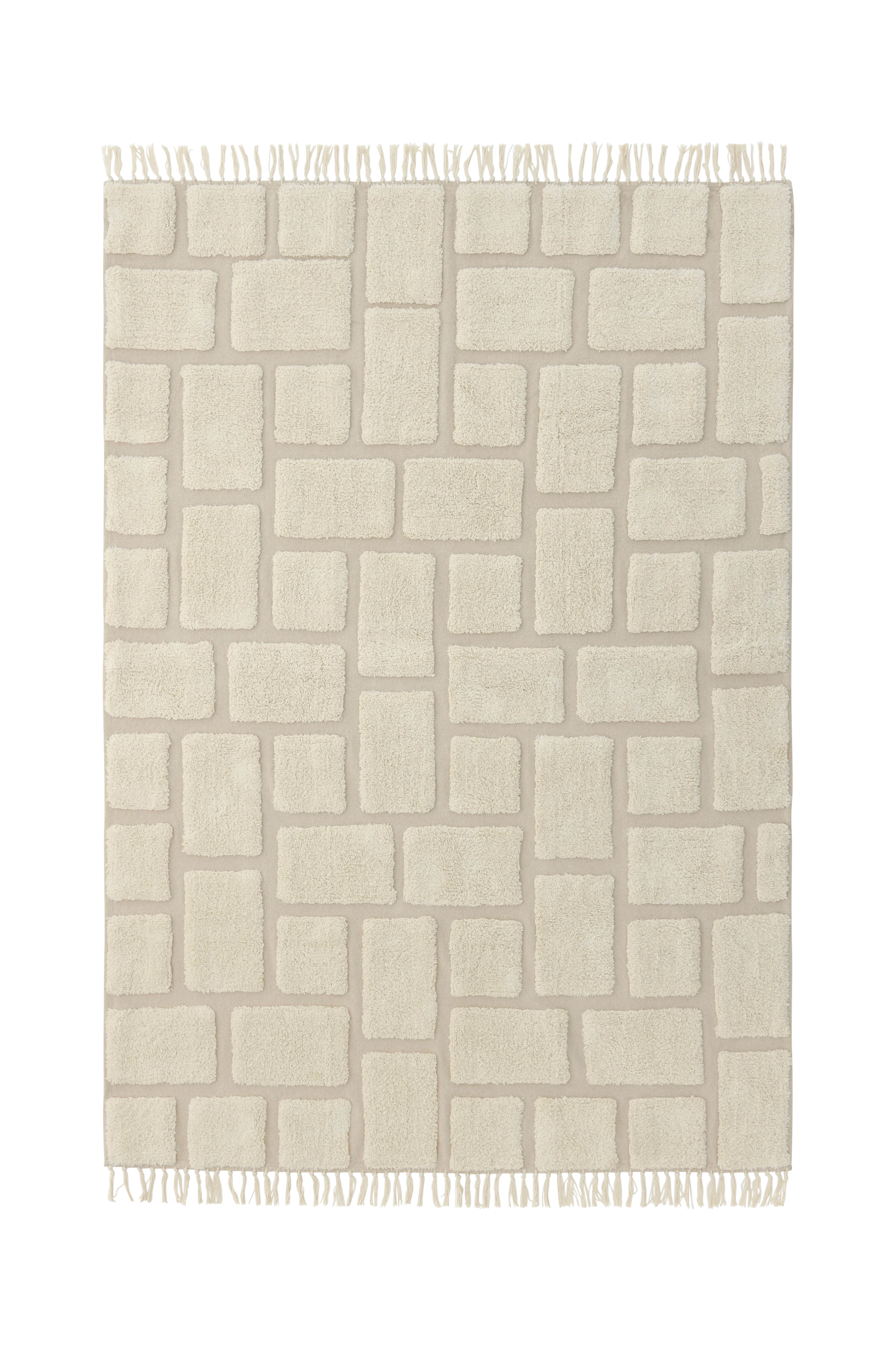 Handvävd bomullsmatta med tuftat mönster. Fransar på kortsidorna.