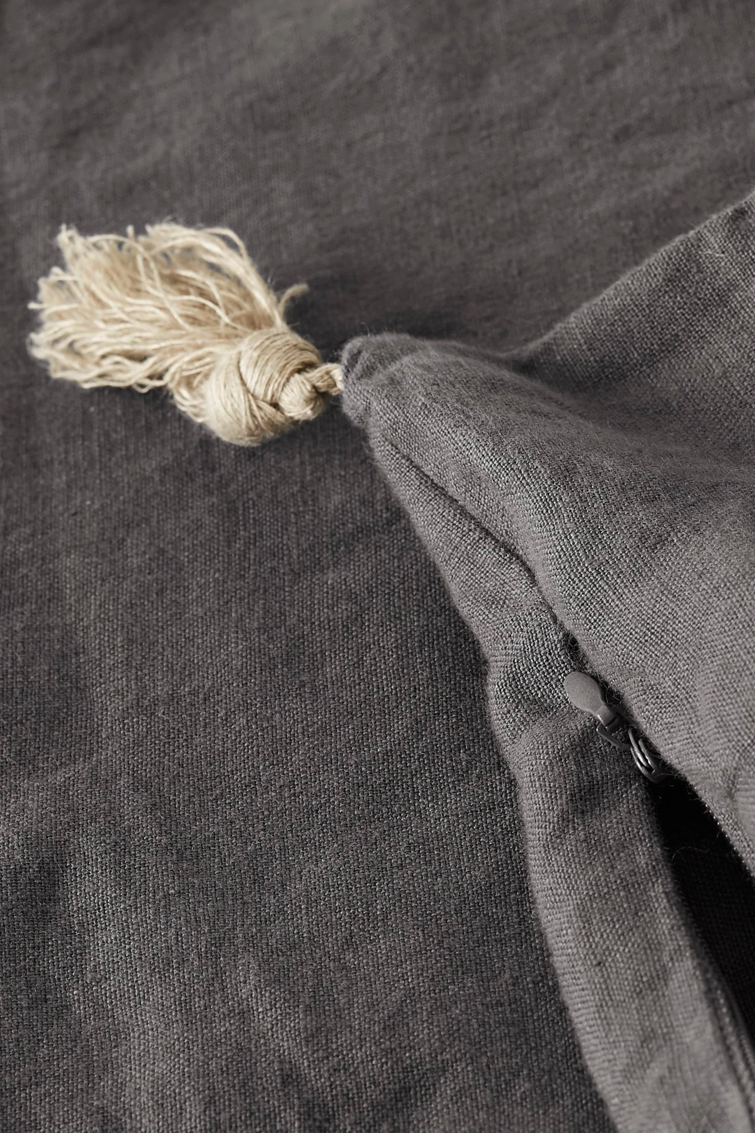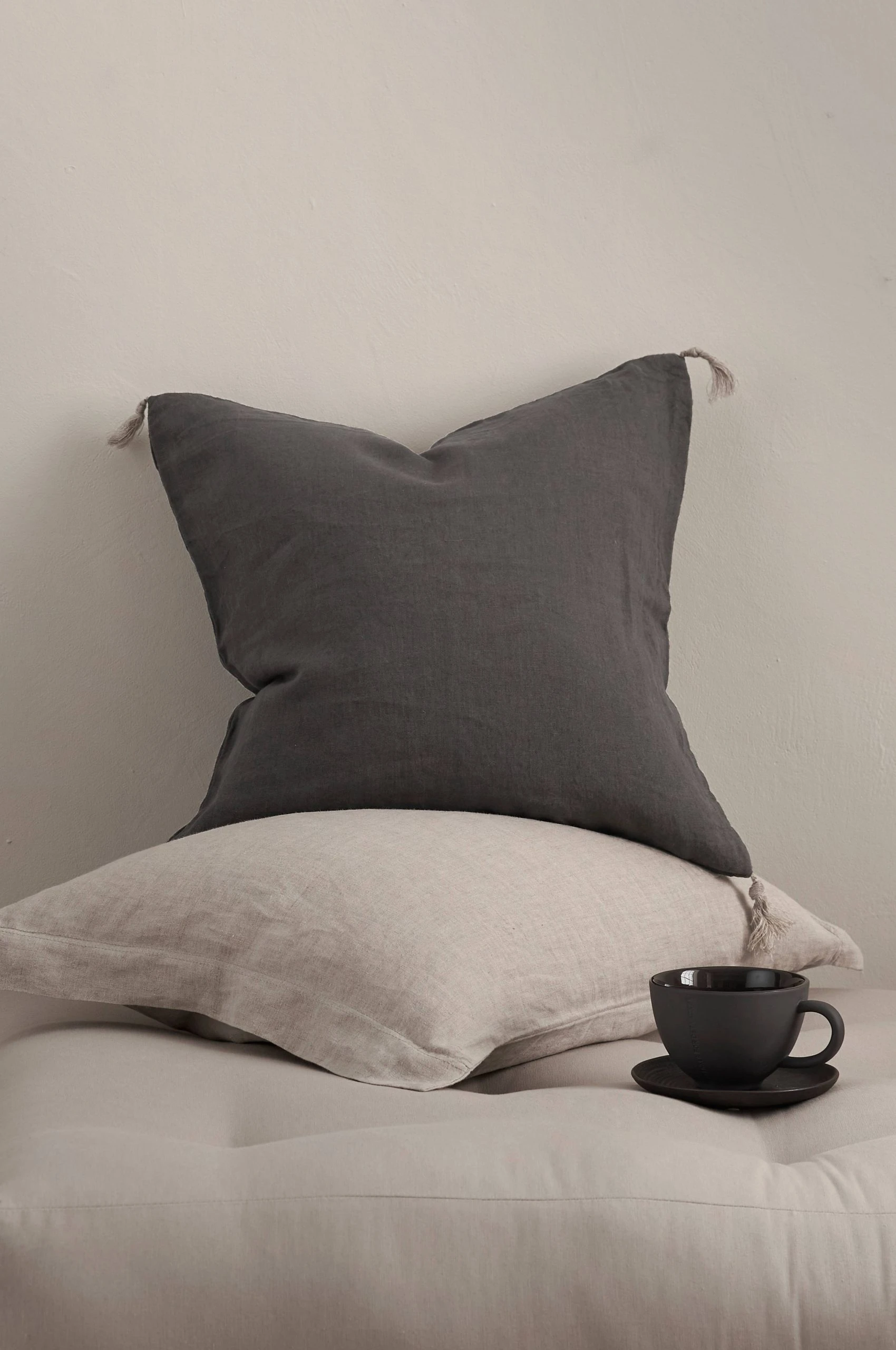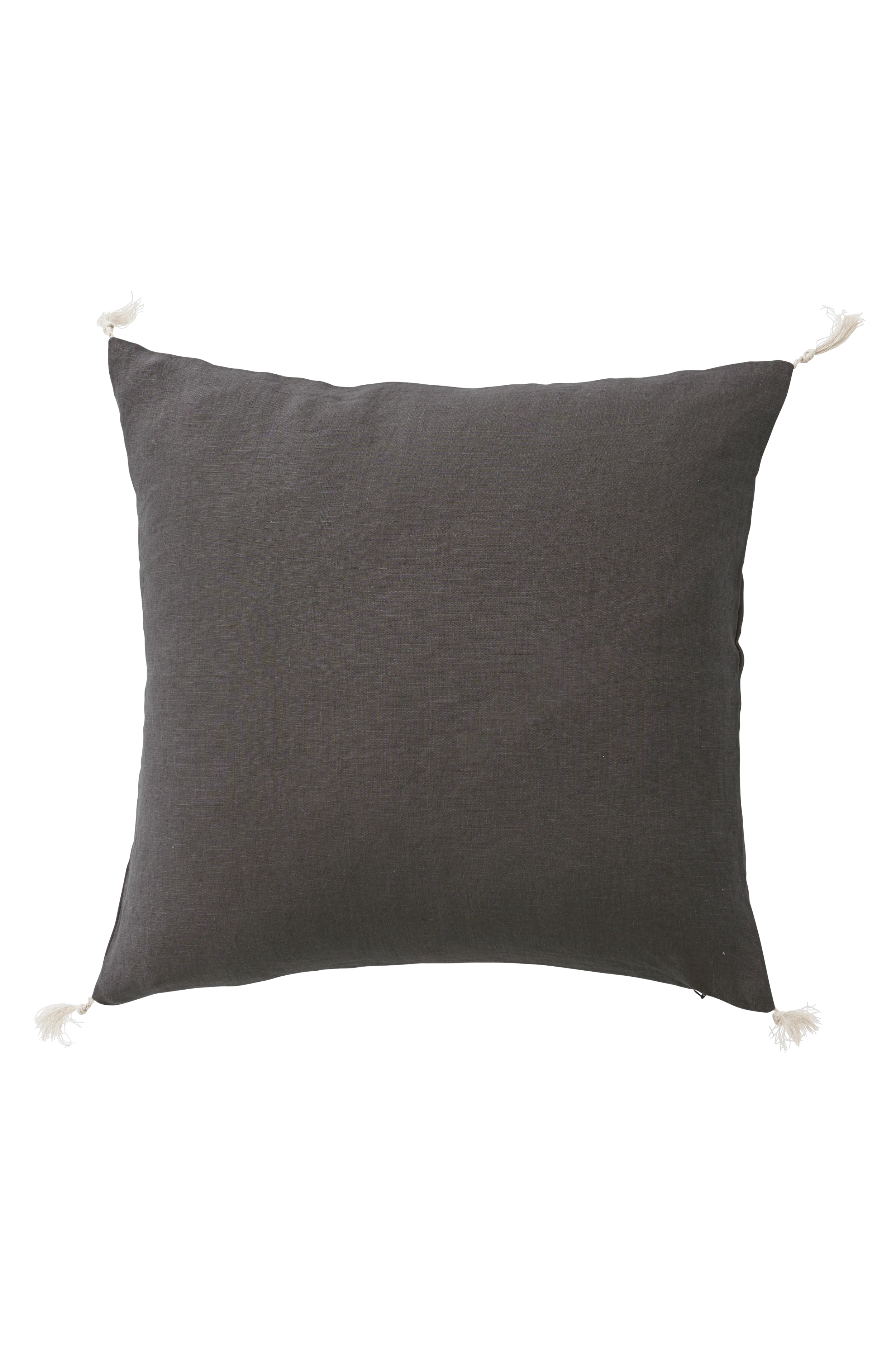 Kuddfodral i mjuk tvättad kvalitet av franskt lin med vintagelook och dekorativa, handsydda stygn. Tofsar av linnegarn i alla hörn. Dold dragkedja i botten. Stl 50×50 cm.