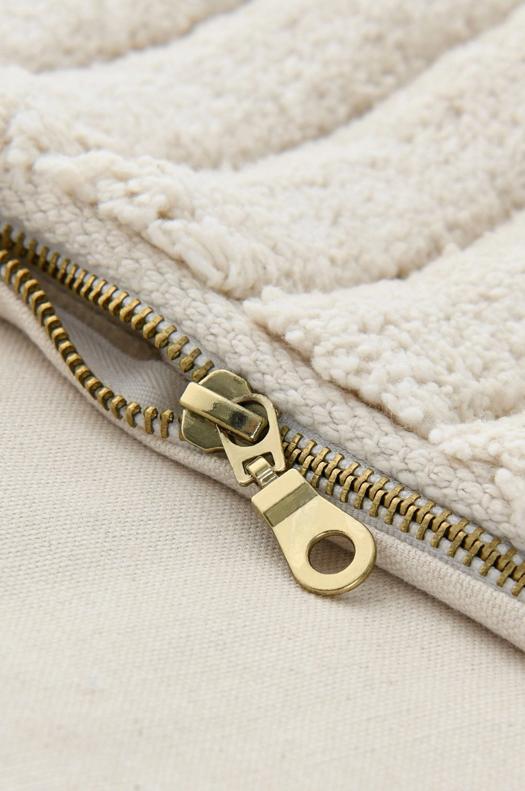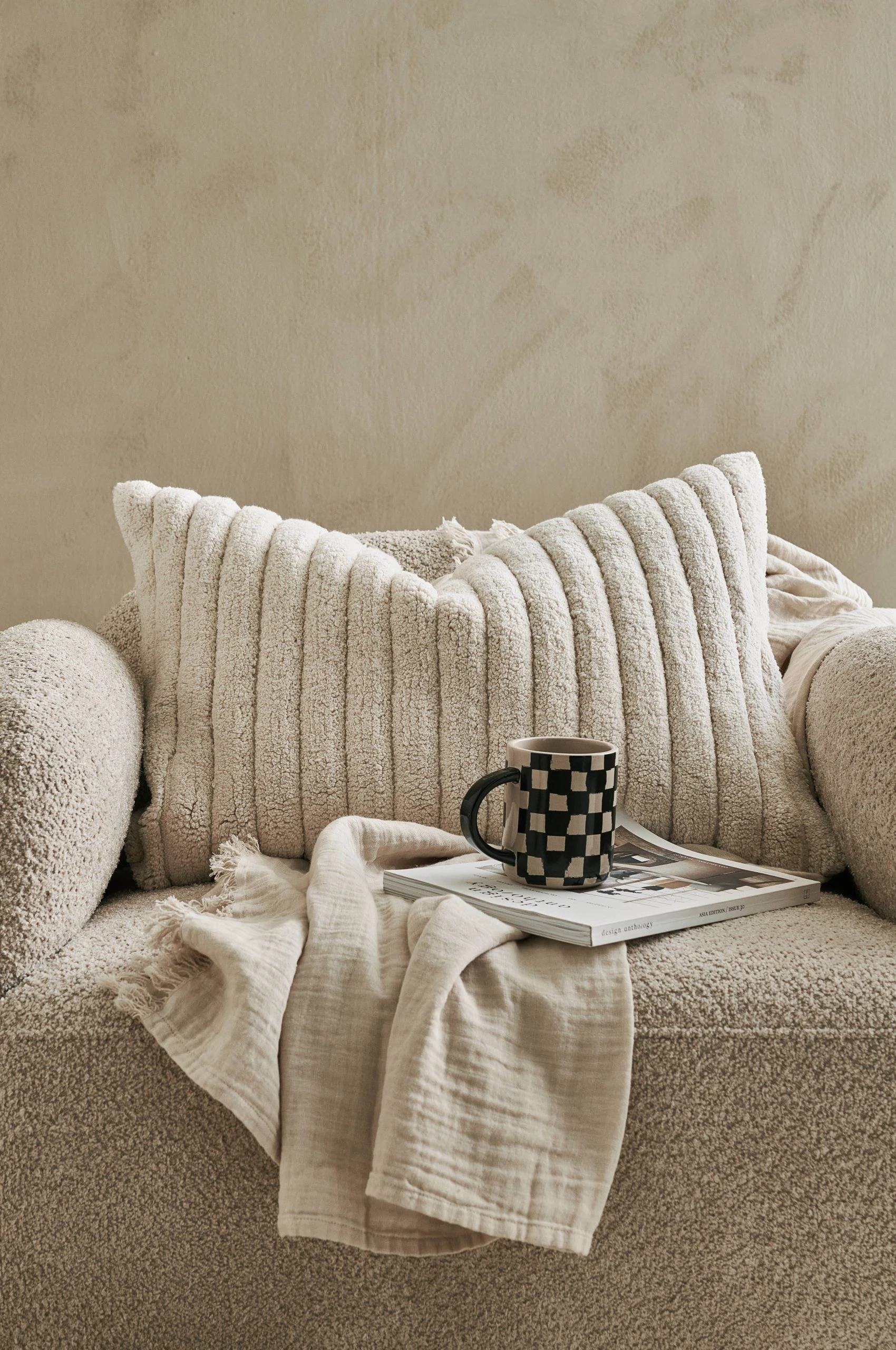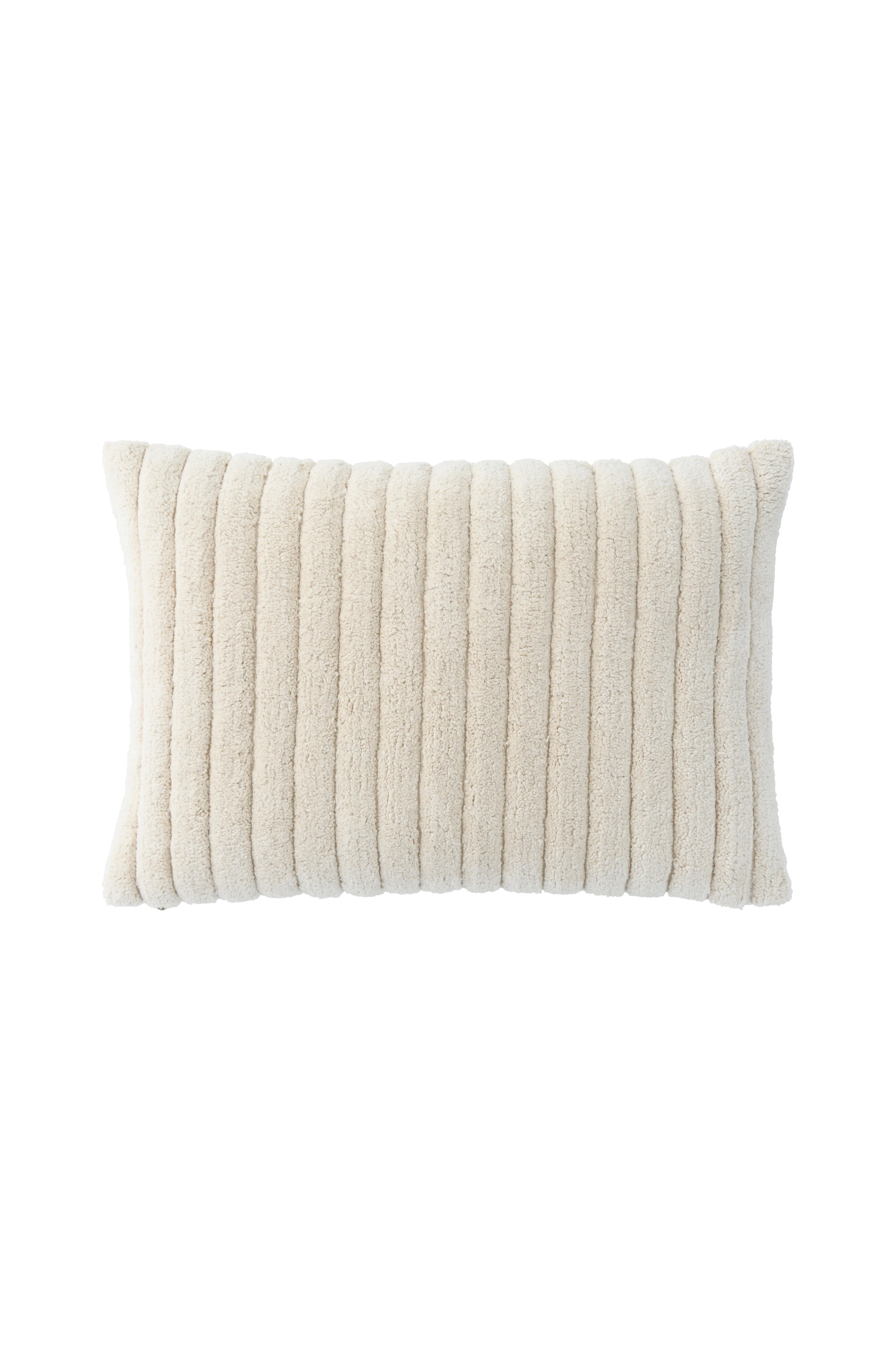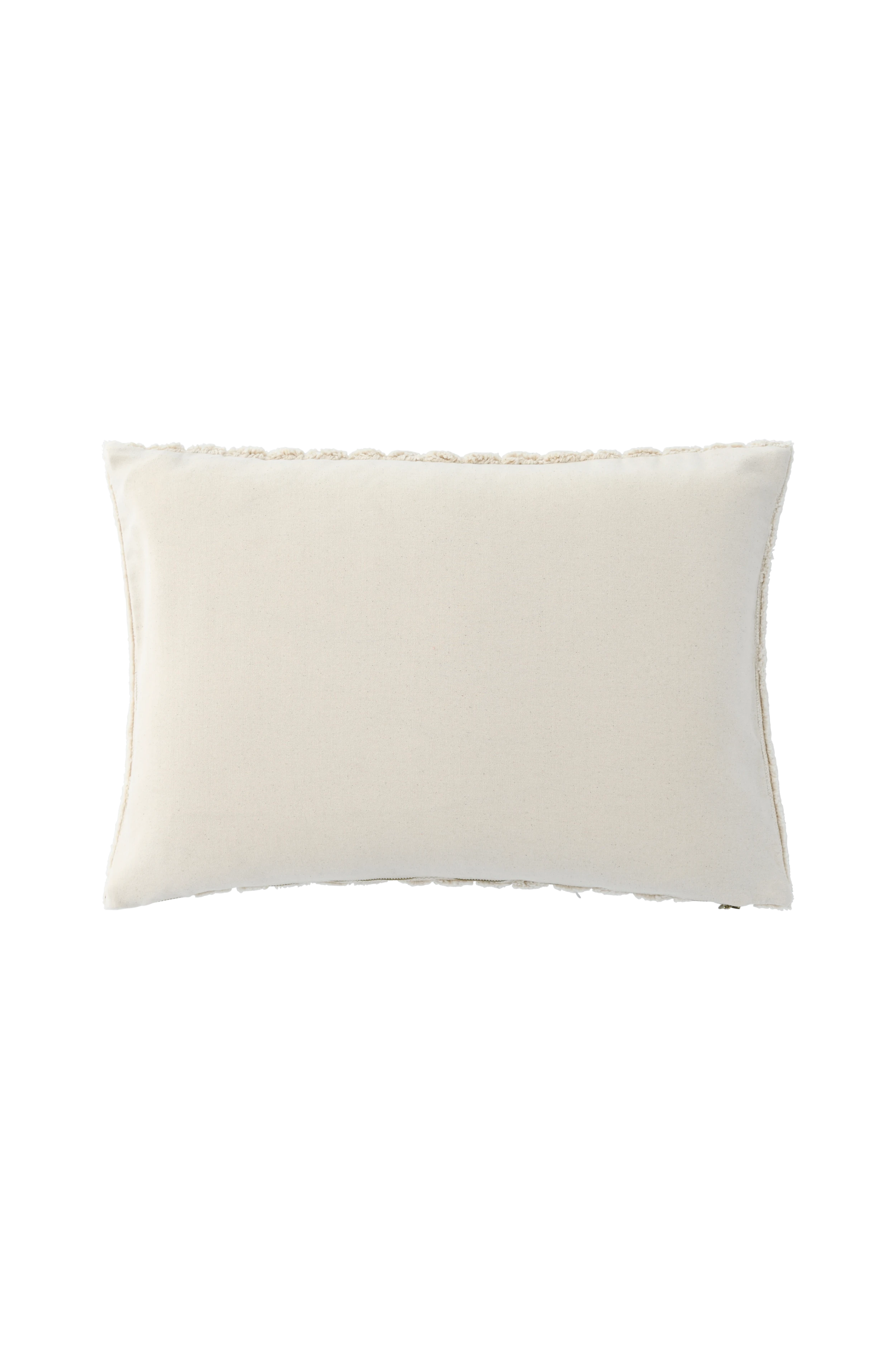 Kuddfodral med framsida i grov bomull med tuftat randmönster. Baksida i halvpanama. Metalldragkedja i botten.