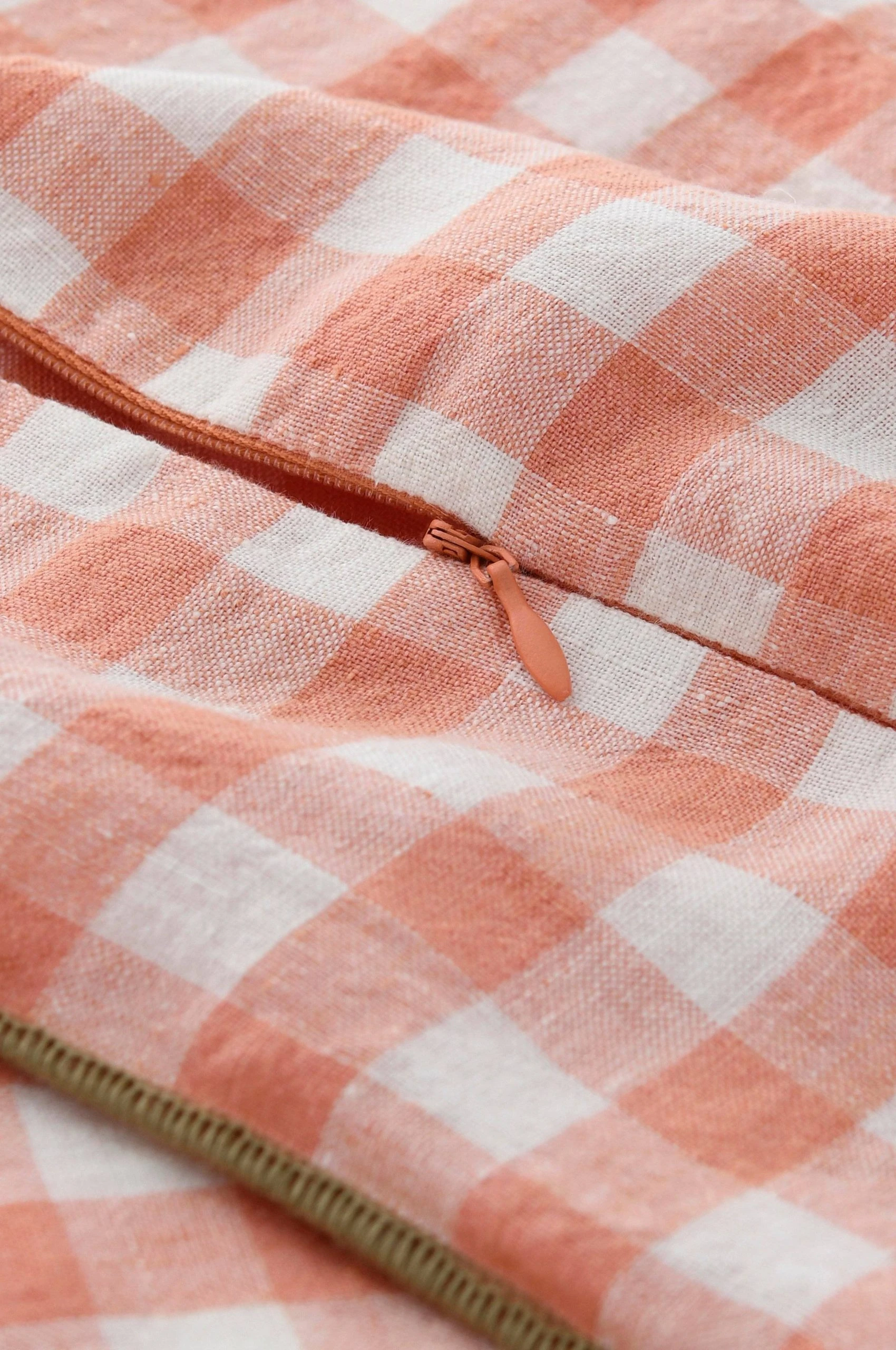 Kuddfodral i mjuk, tvättad linnekvalitet av franskt lin med garnfärgad ruta. Kontrasterande, tät overlocksöm runt om. Dragkedja på baksidan.