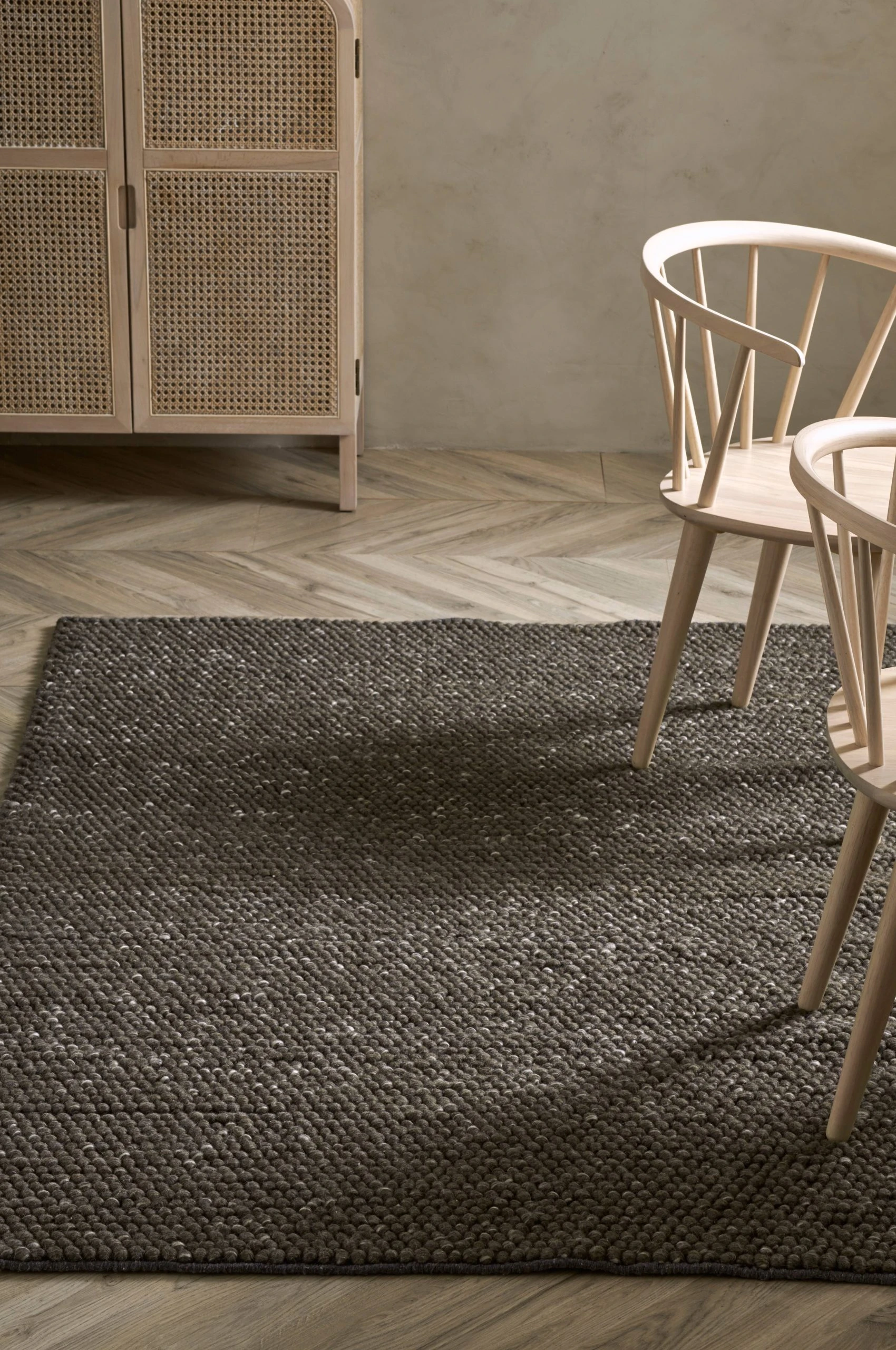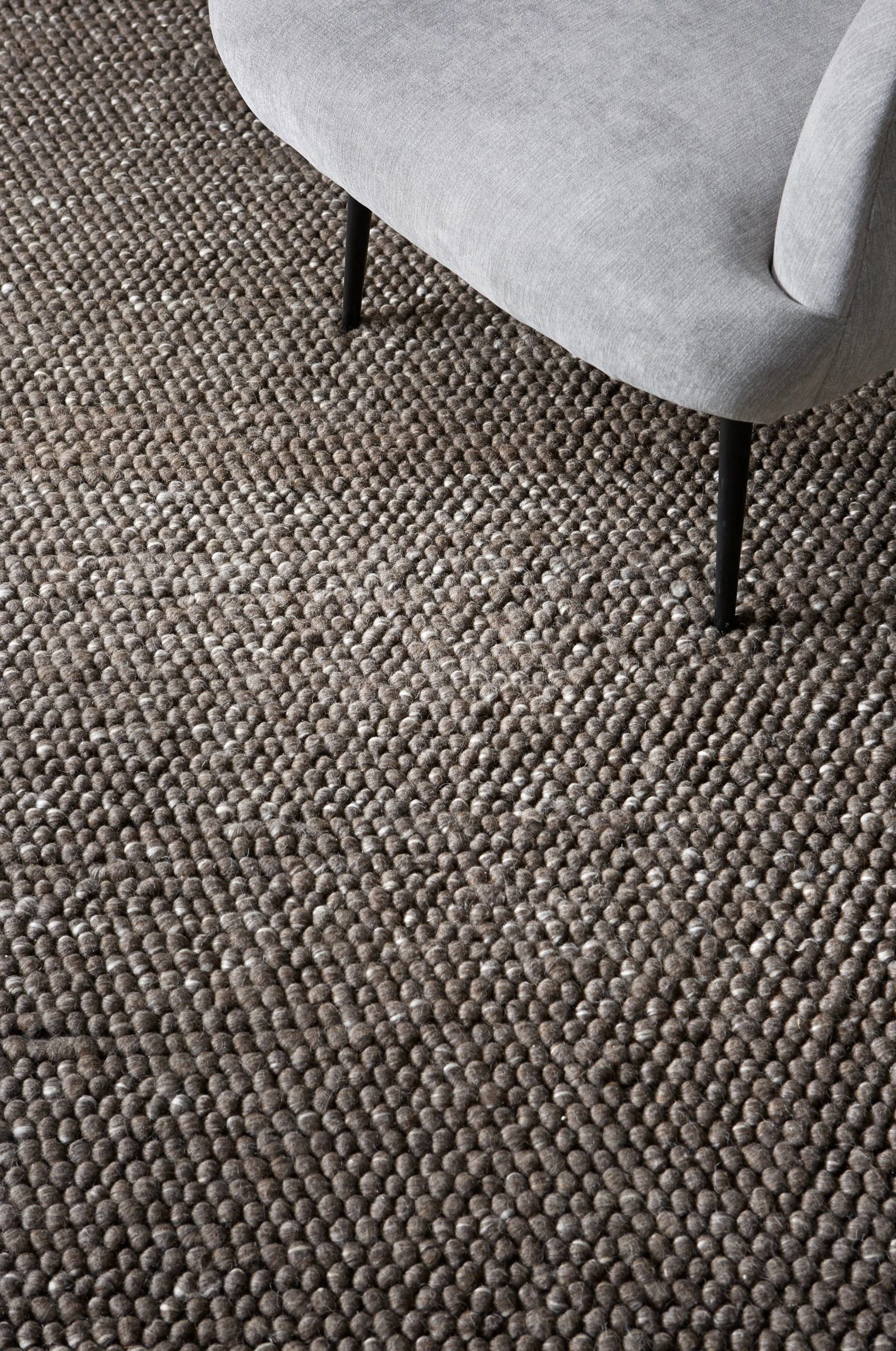 Handvävd matta i en mix av mjuk, tjock ull från Nya Zeeland och viskos. Strukturmönstrad, bubblig yta och melerad effekt.