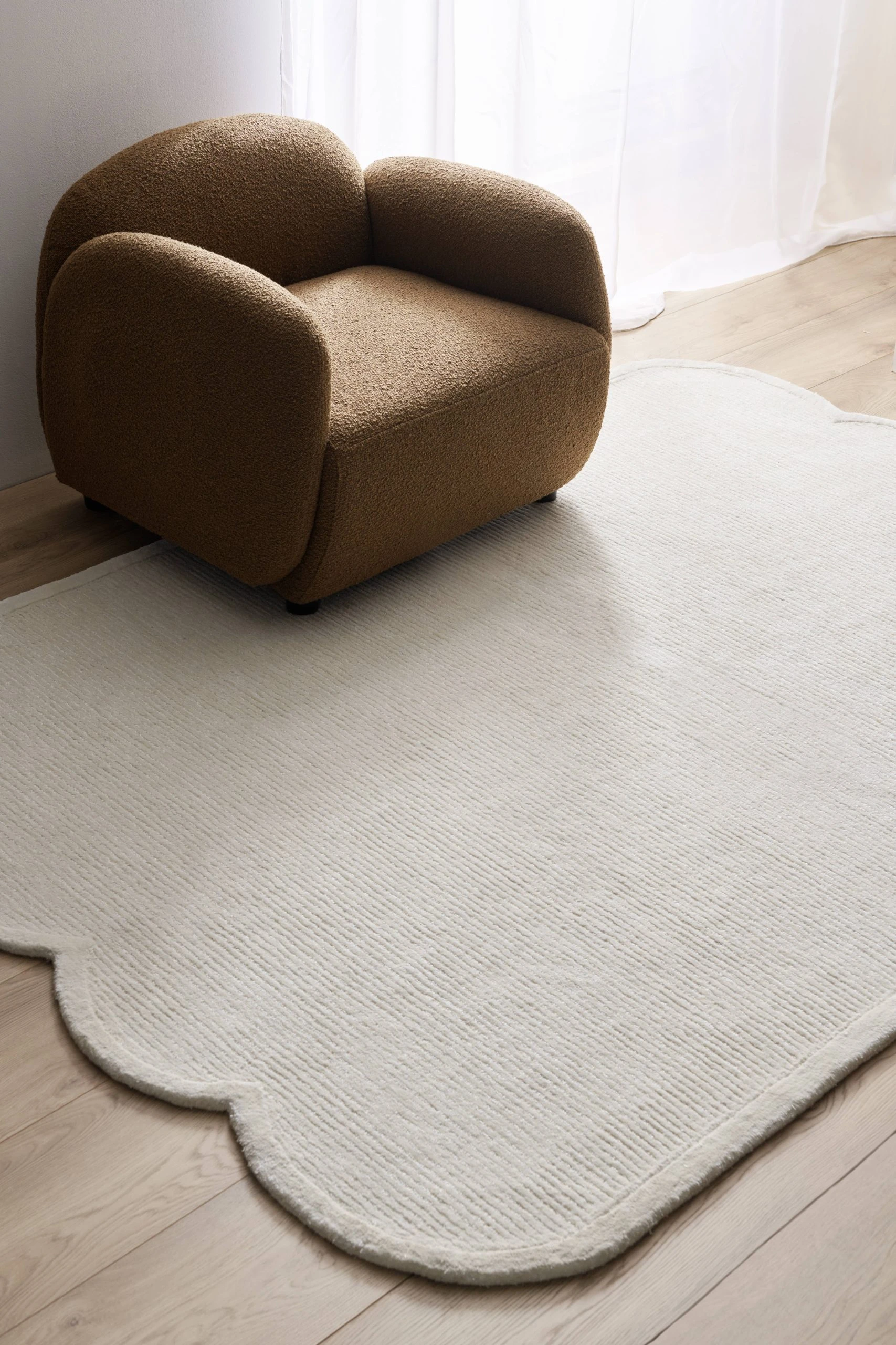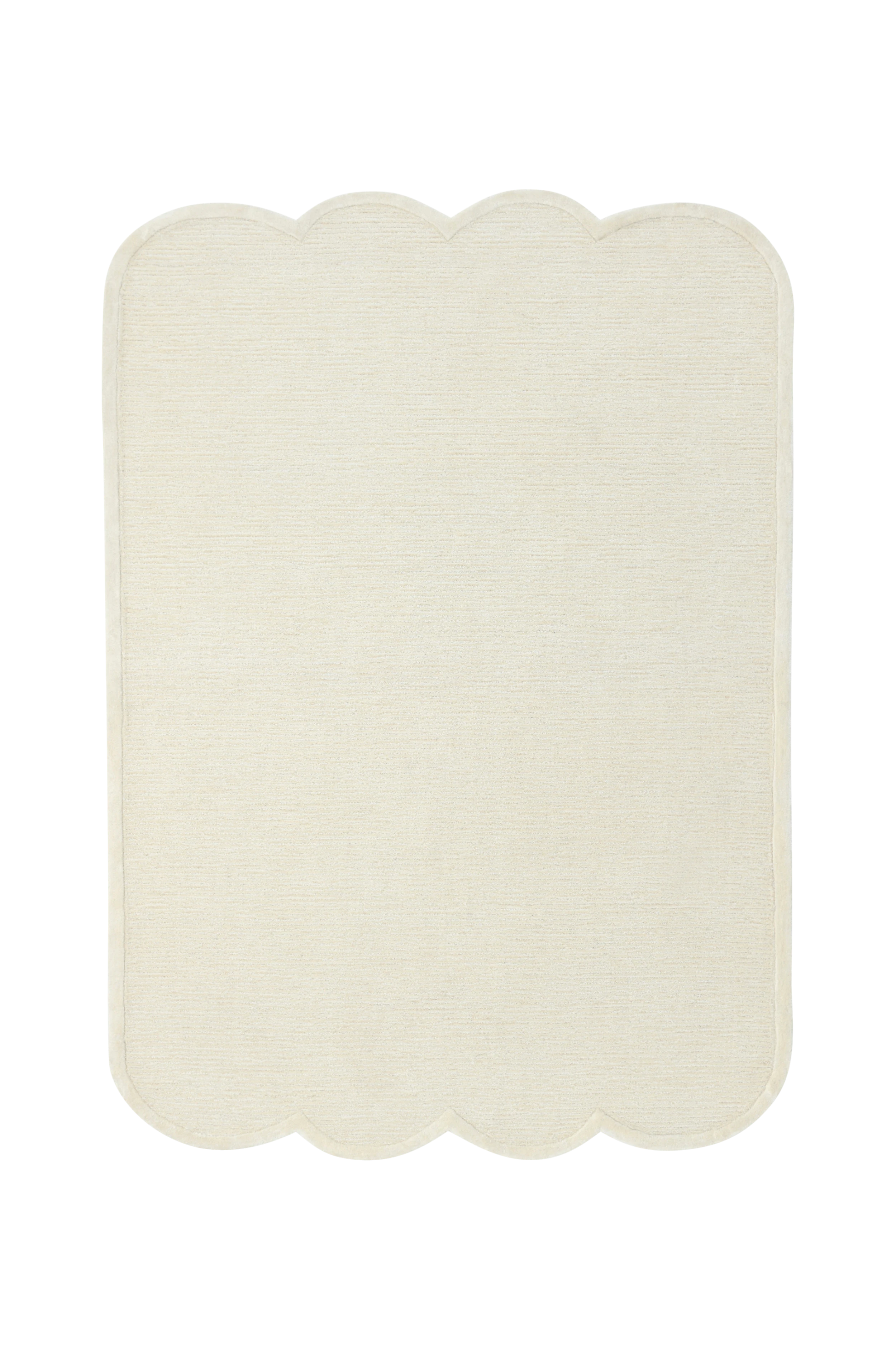 Handtuftad matta i ull och viskos, en blandning av material som ger både mjukhet och lyster. Mattan har en randig struktur och vågiga kanter på kortsidorna.