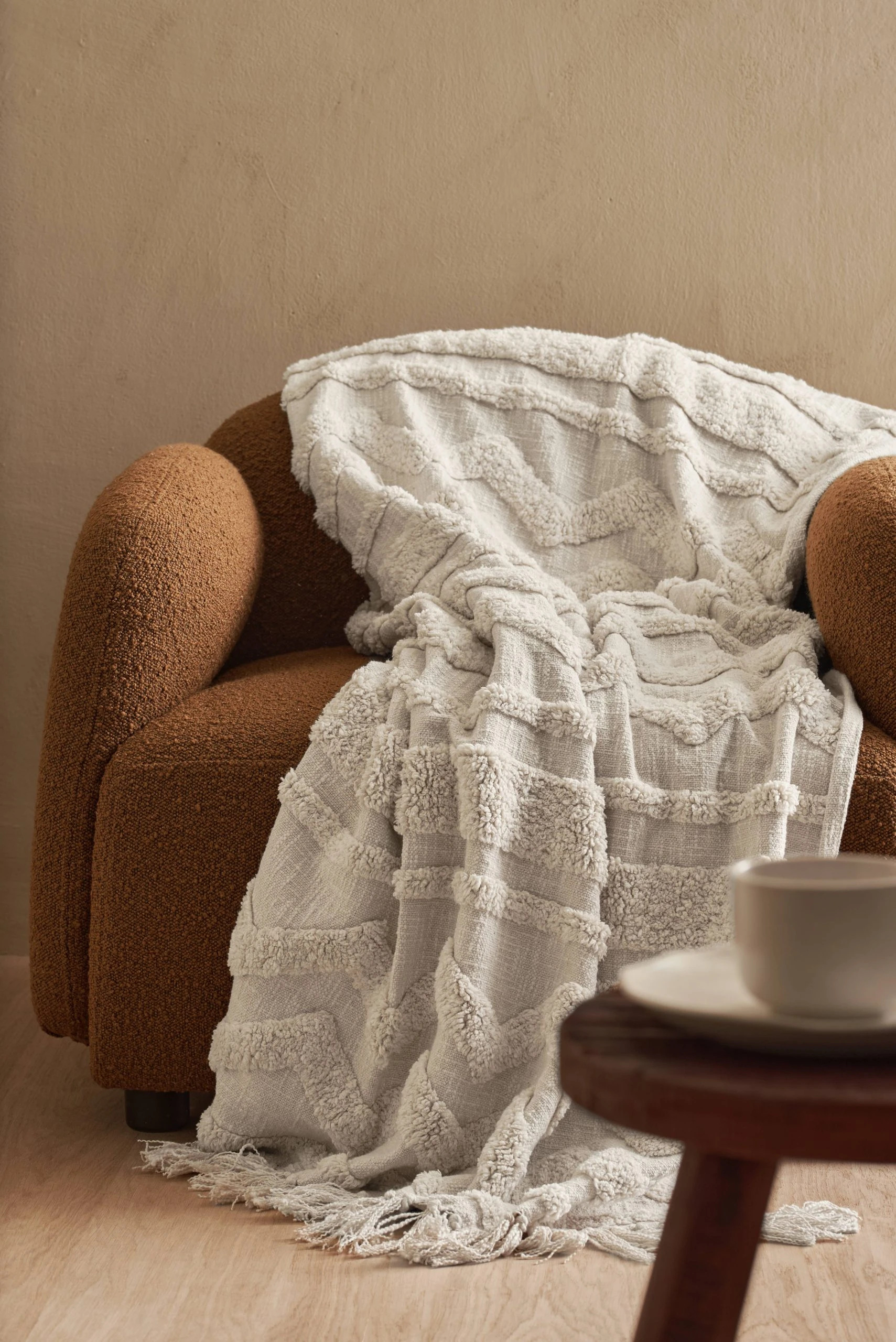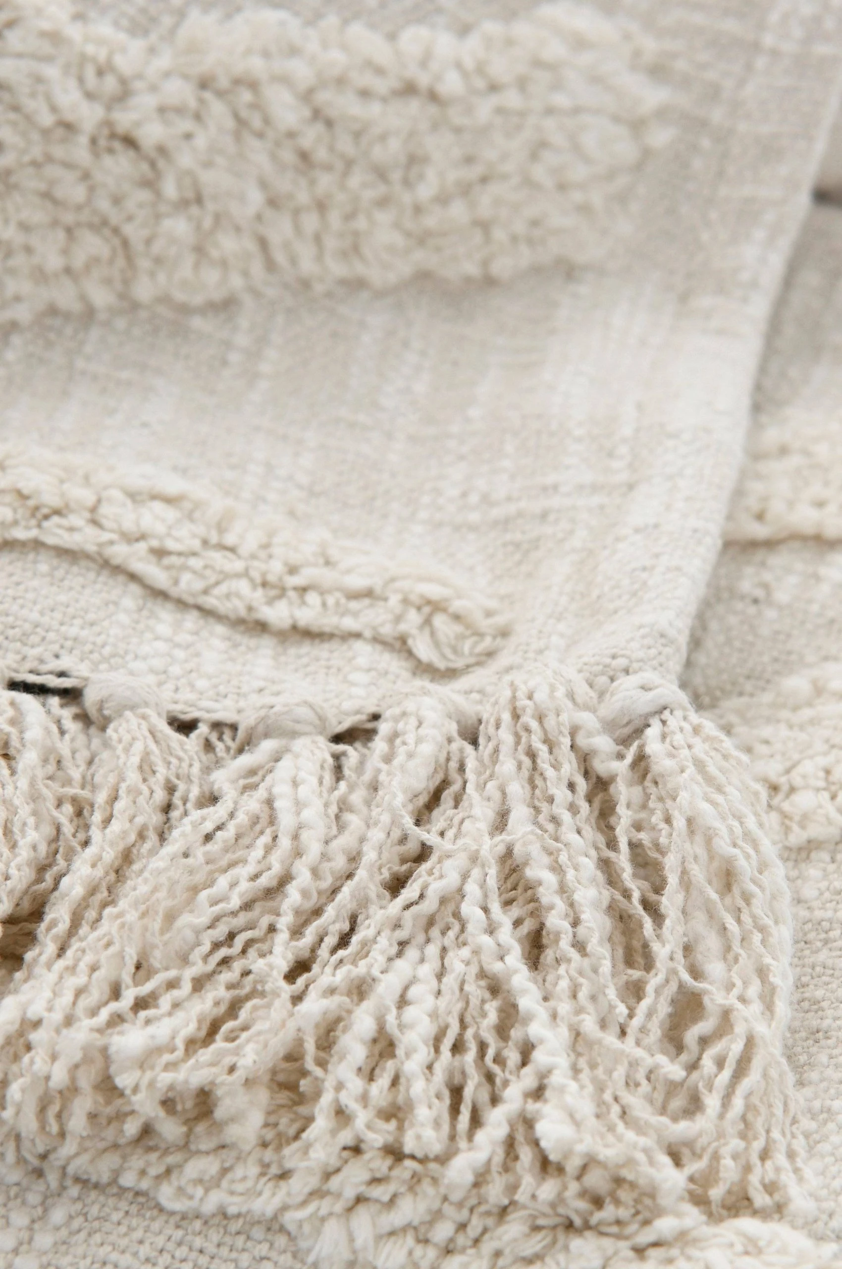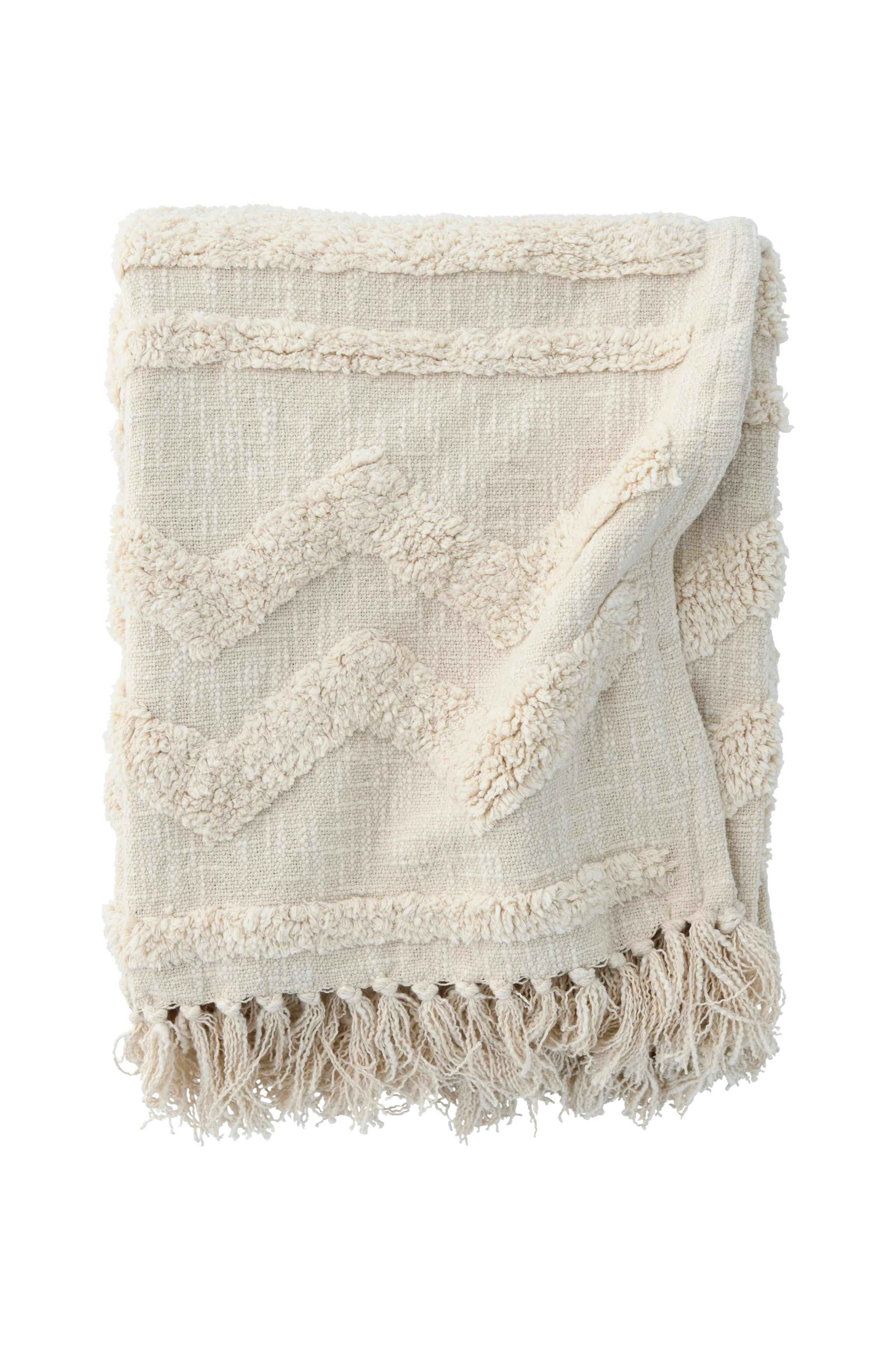 Pläd i lite grövre bomullskvalitet med struktur och tuftat mönster på framsidan. Fransar på kortsidorna. Stl 130×170 cm + 8 cm frans.