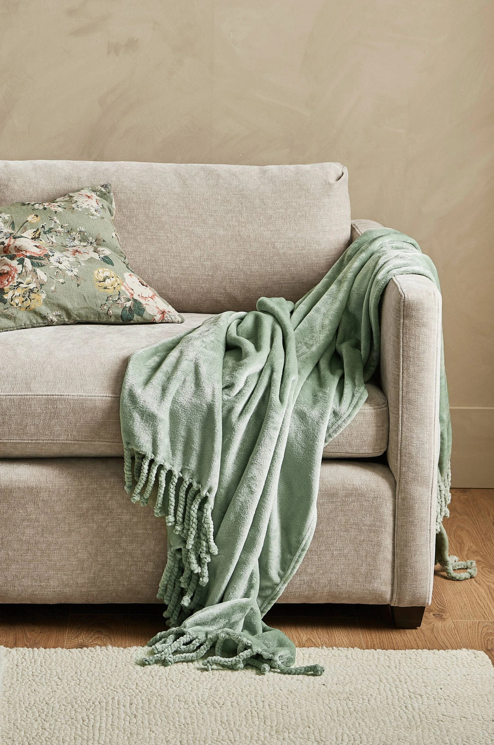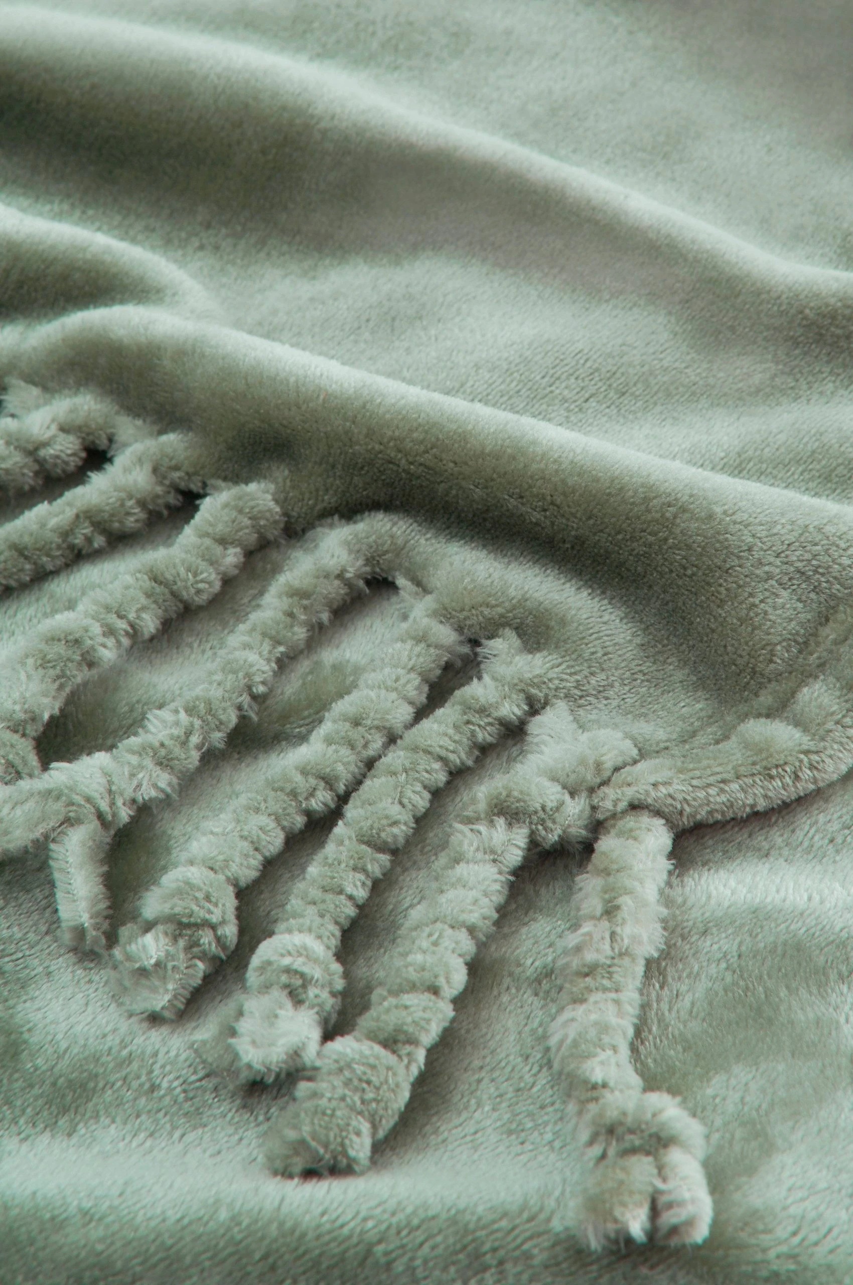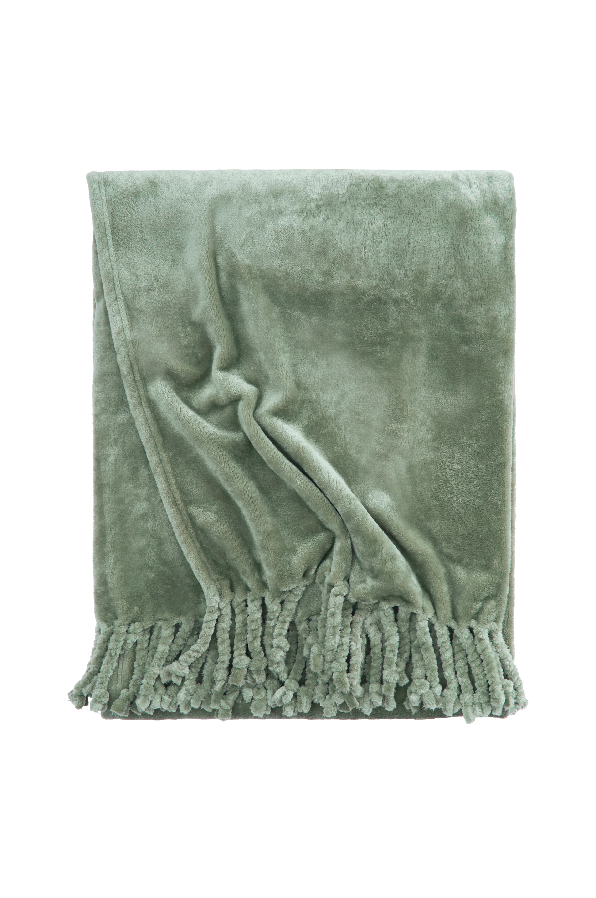 Pläd i mjuk och skön fleece med lätt lyster och handgjorda fransar. Stl 130×170 cm + 8 cm fransar på varje kortsida.