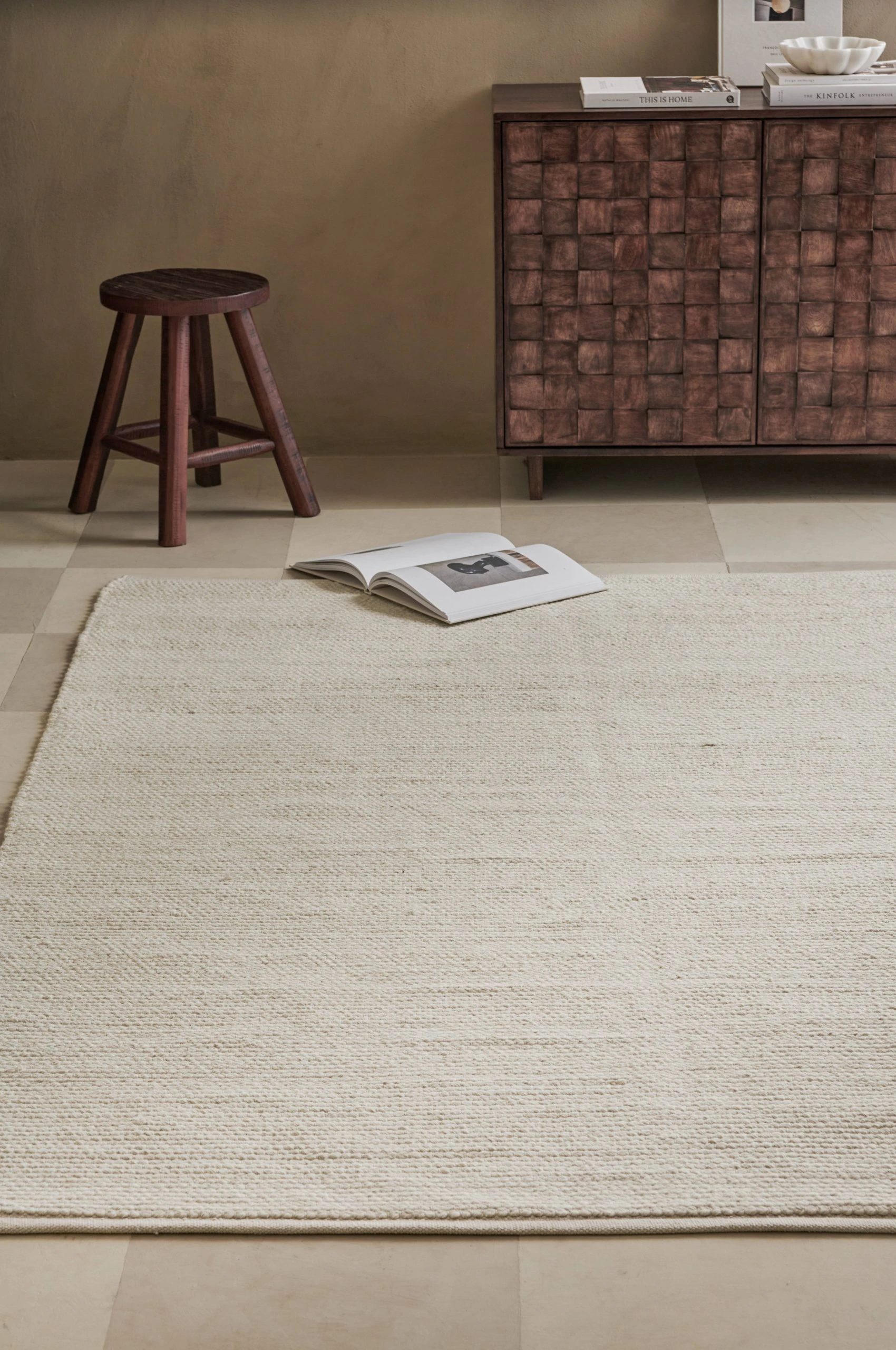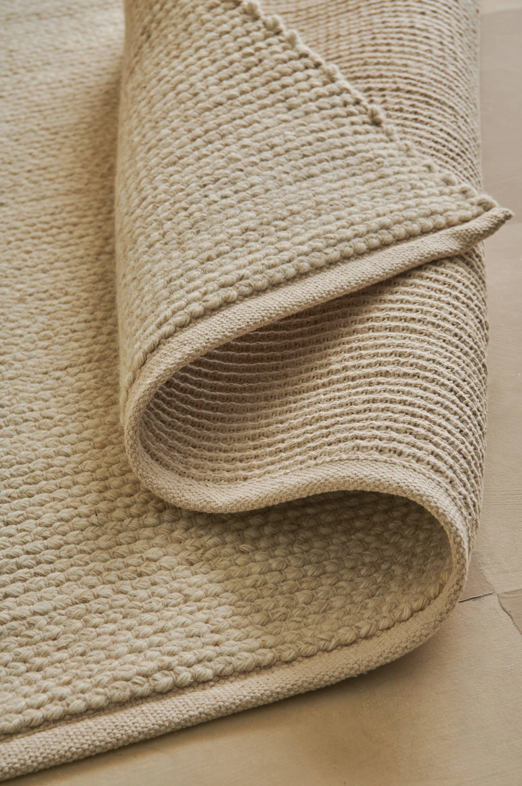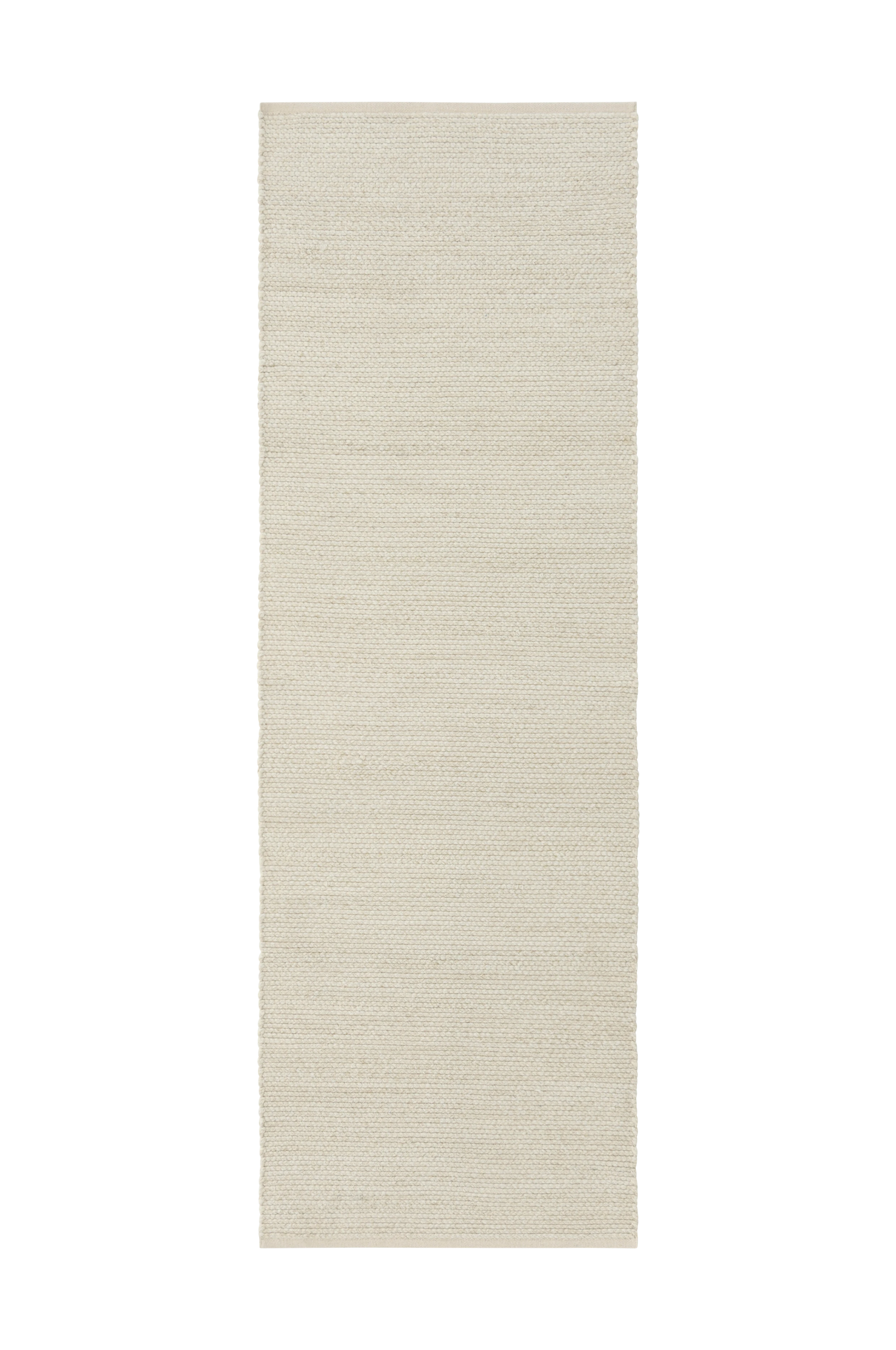 Handvävd matta i RWS-certifierad ull med flätad struktur. Varp i bomull. Mattans tjocklek 1 cm.