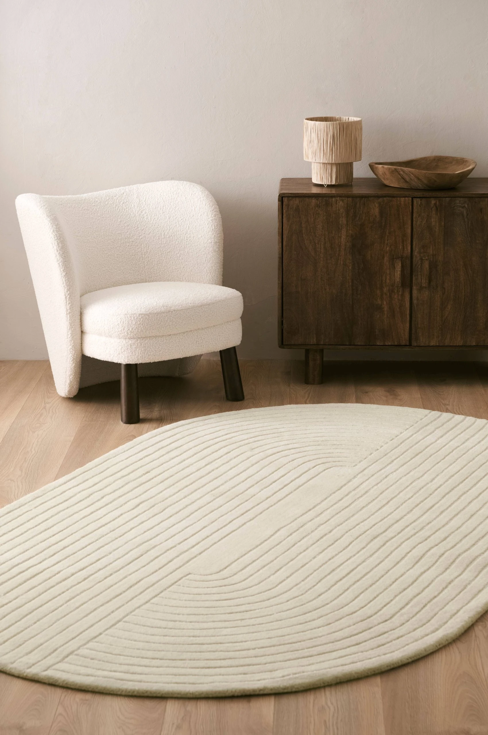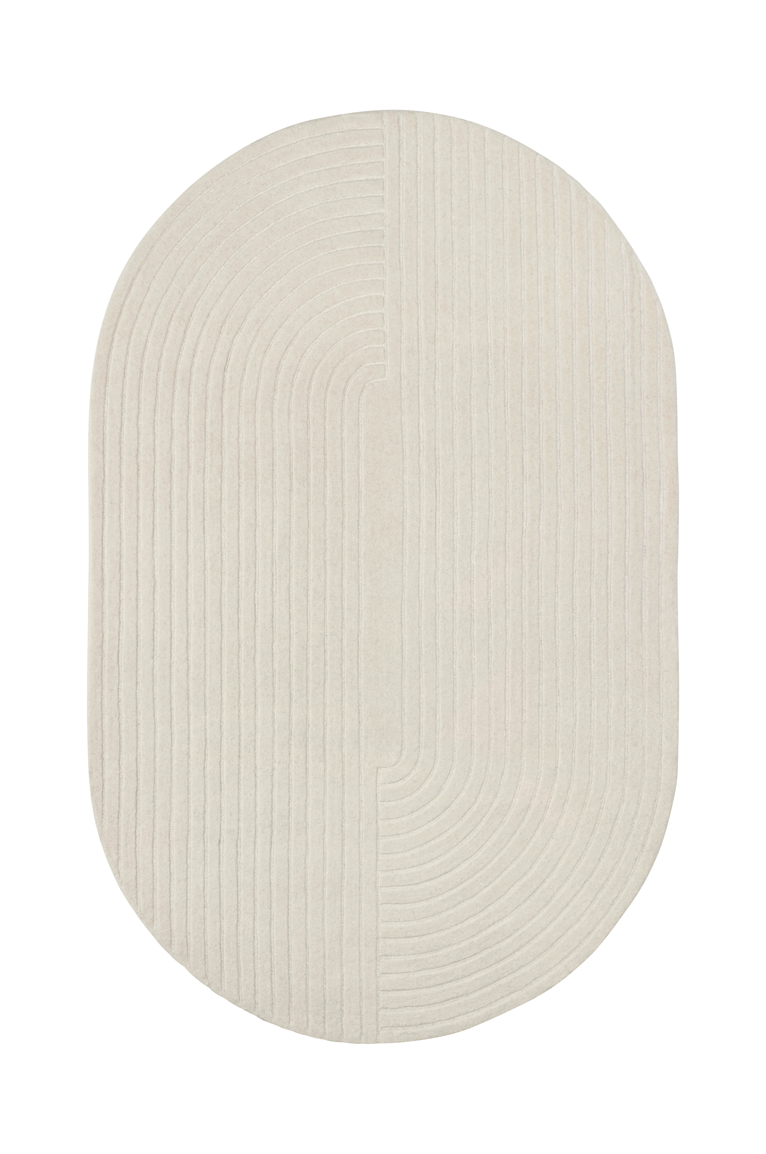 Handtuftad, oval ullmatta med reliefmönster. Höjd ca 2 cm.