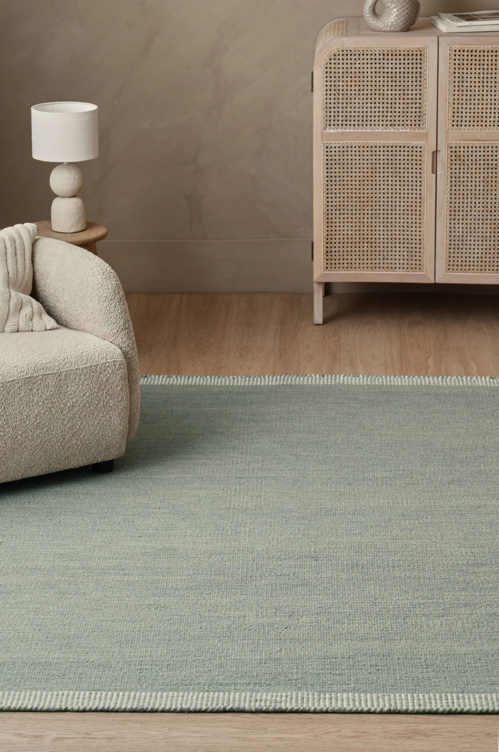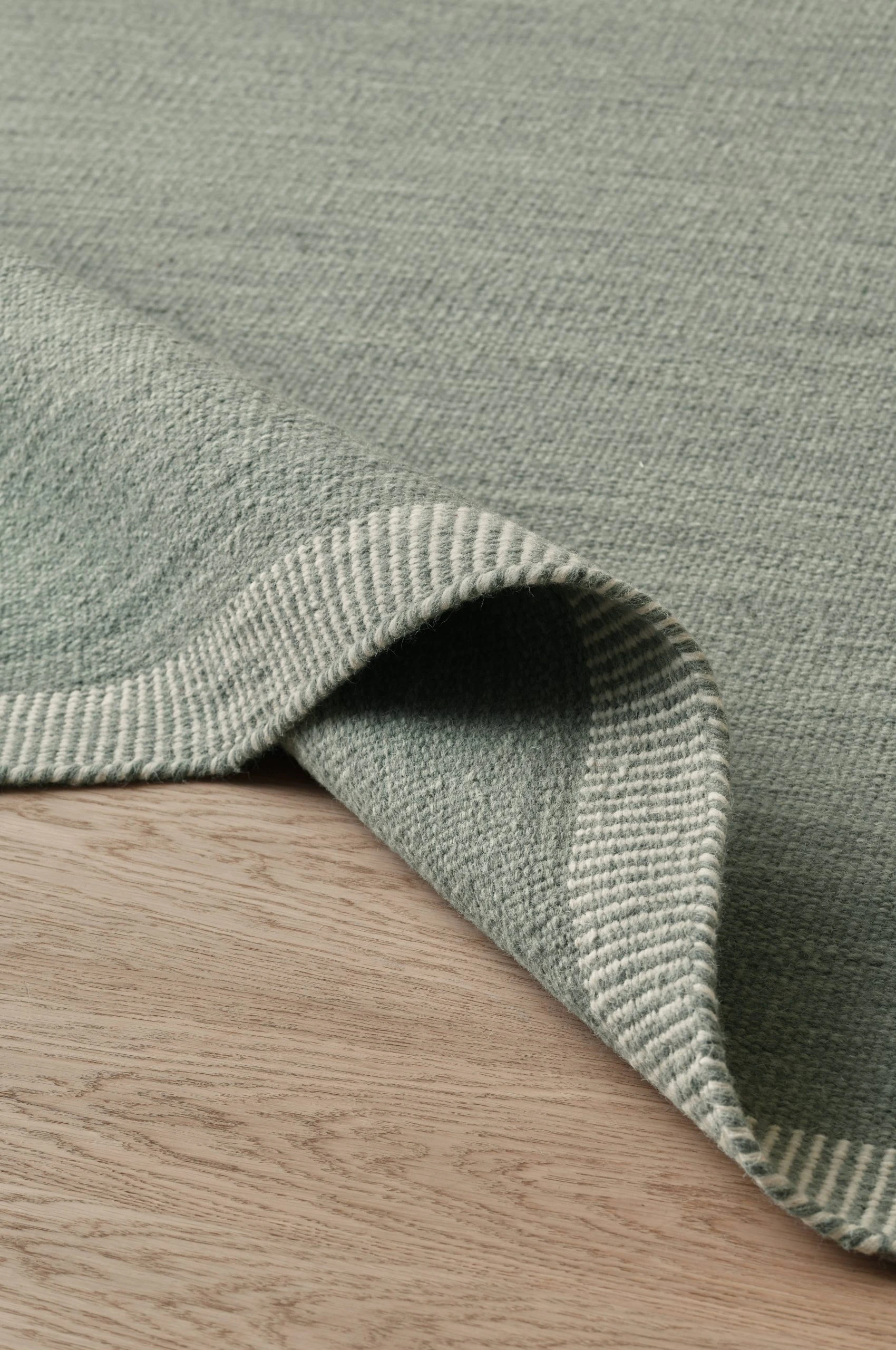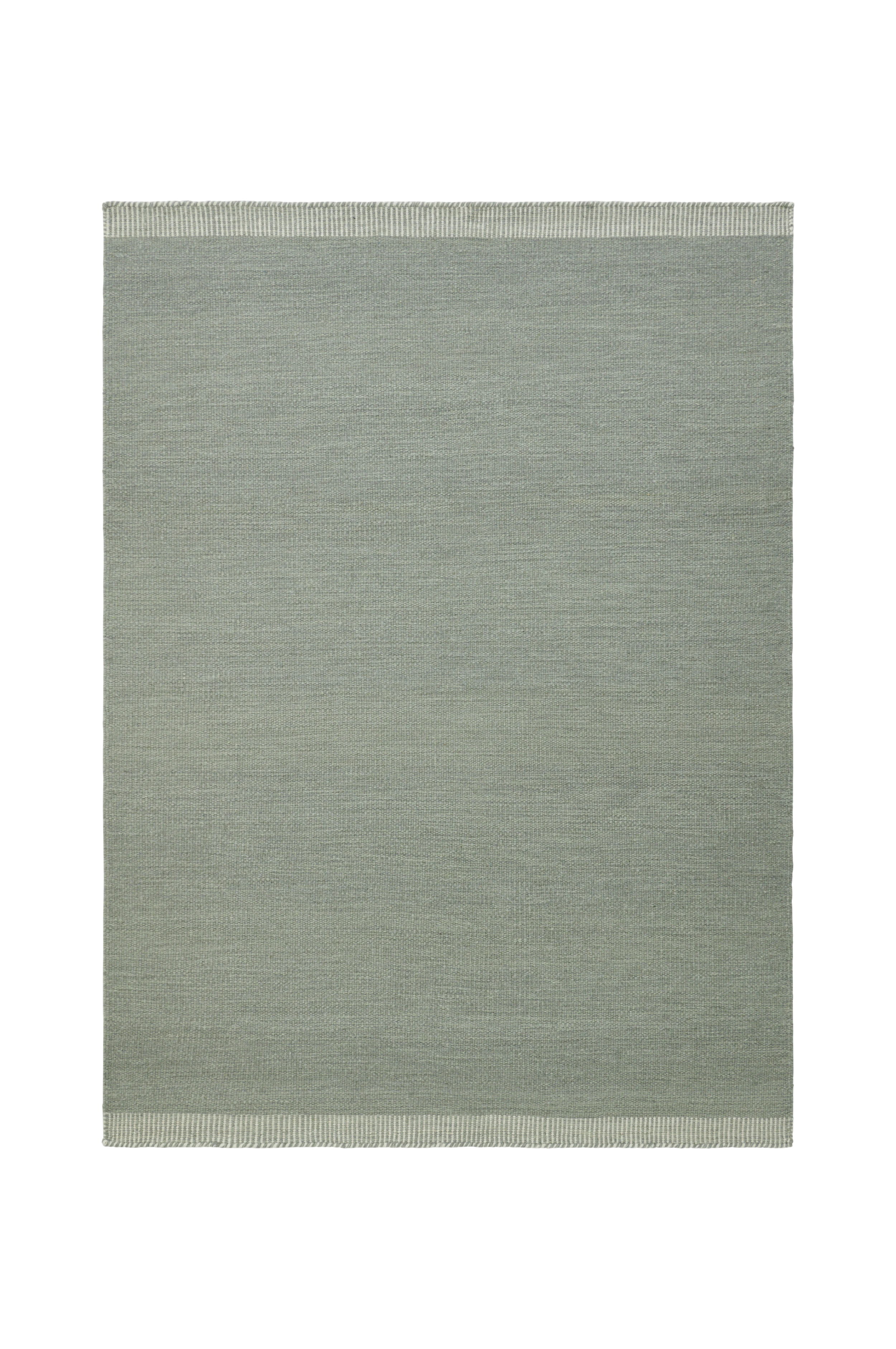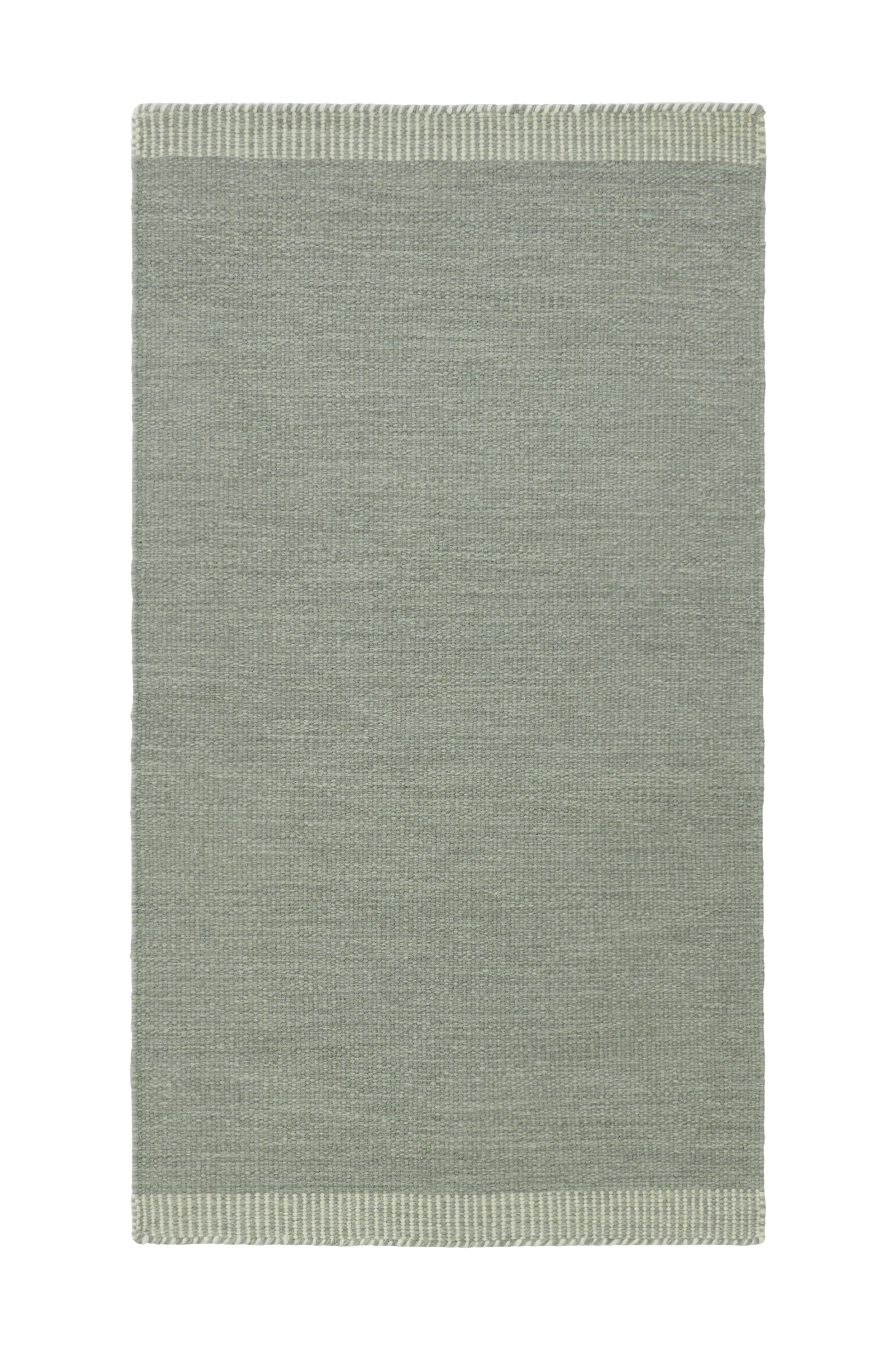 Handvävd ullmatta i melerad look. Randmönstrade avslut i kortändarna.