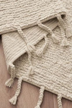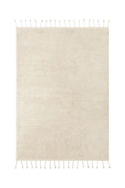 Handtuftad bomullsmatta med flÀtade fransar pÄ kortsidorna. Fransarnas lÀngd 15 cm. Mattans tjocklek ca 1 cm.