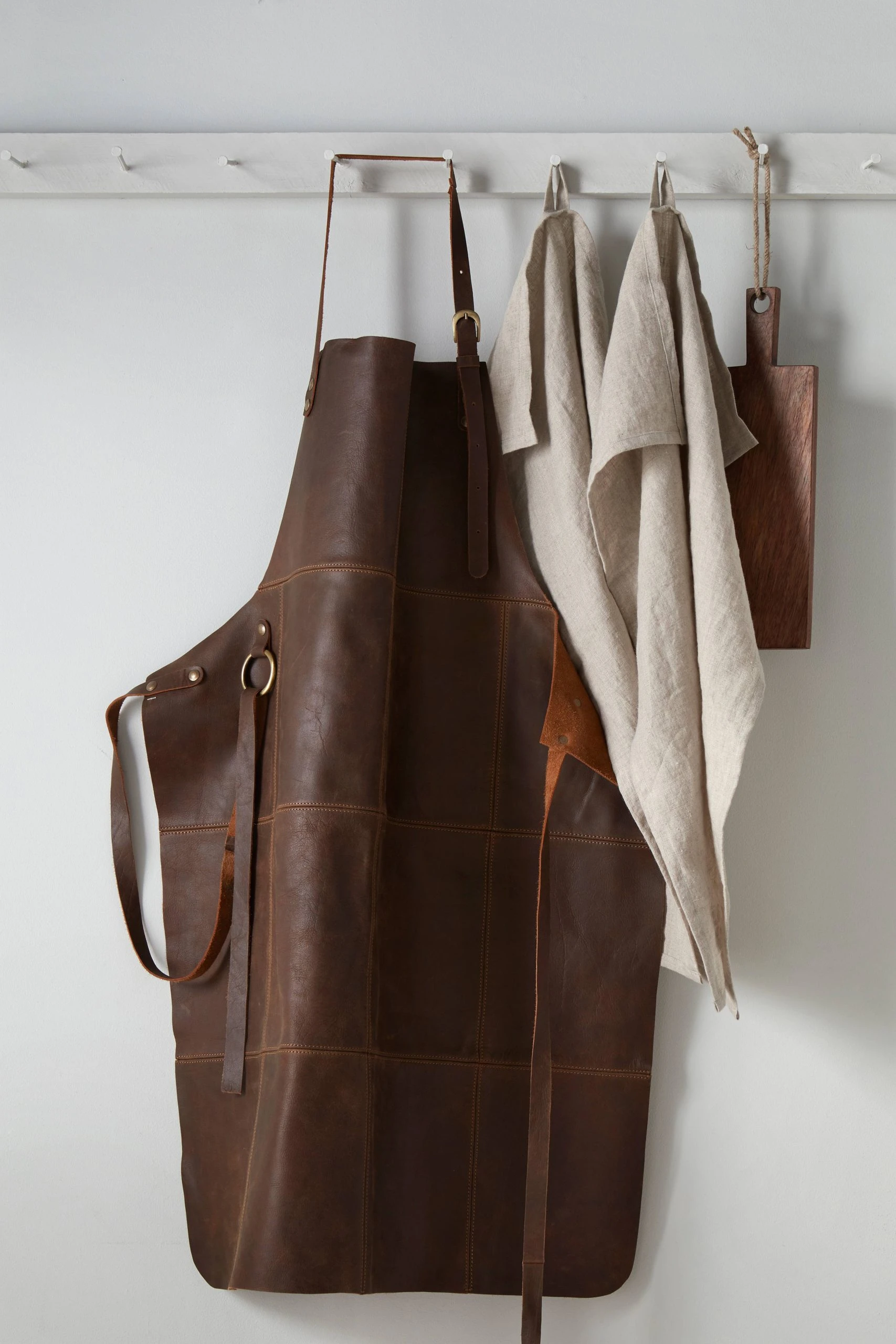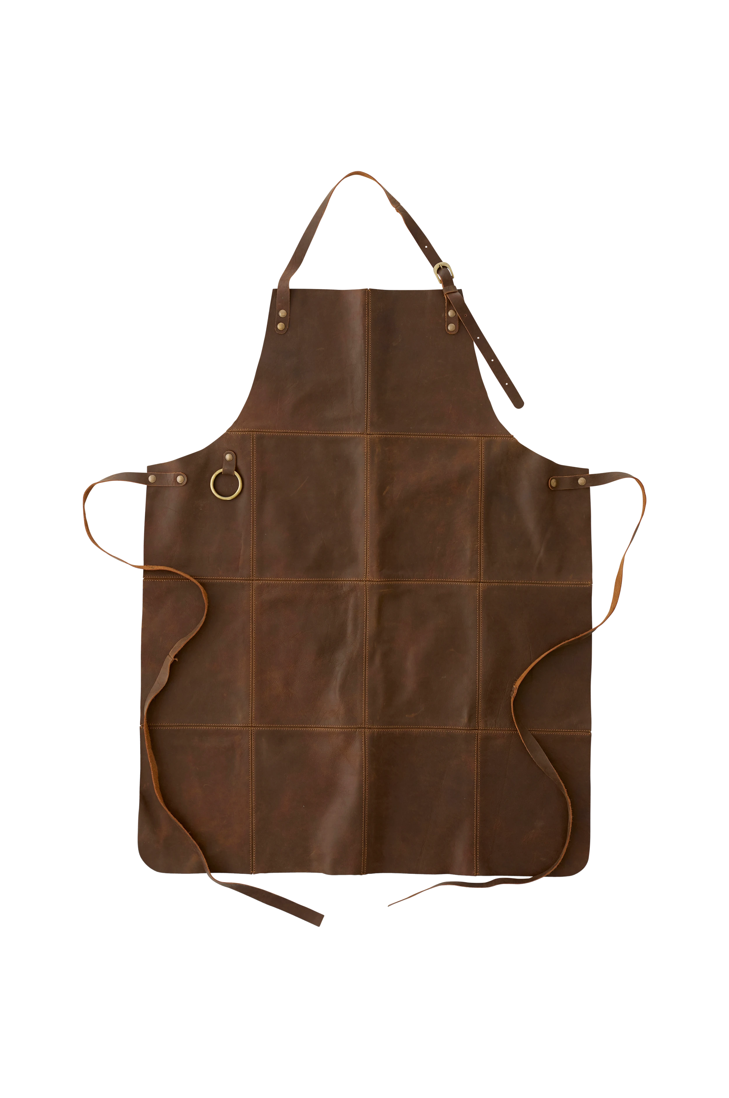 Förkläde av oljat och vaxat skinn i patchwork. Justerbart nackband med metallspänne. Öljett upptill och knytband i sidorna.