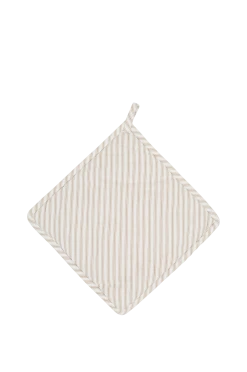 Grytlapp med oemotståndliga ränder tillverkad i fiskbensvävd bomull. Grytlappen har kantband i samma tyg samt märkesetikett.