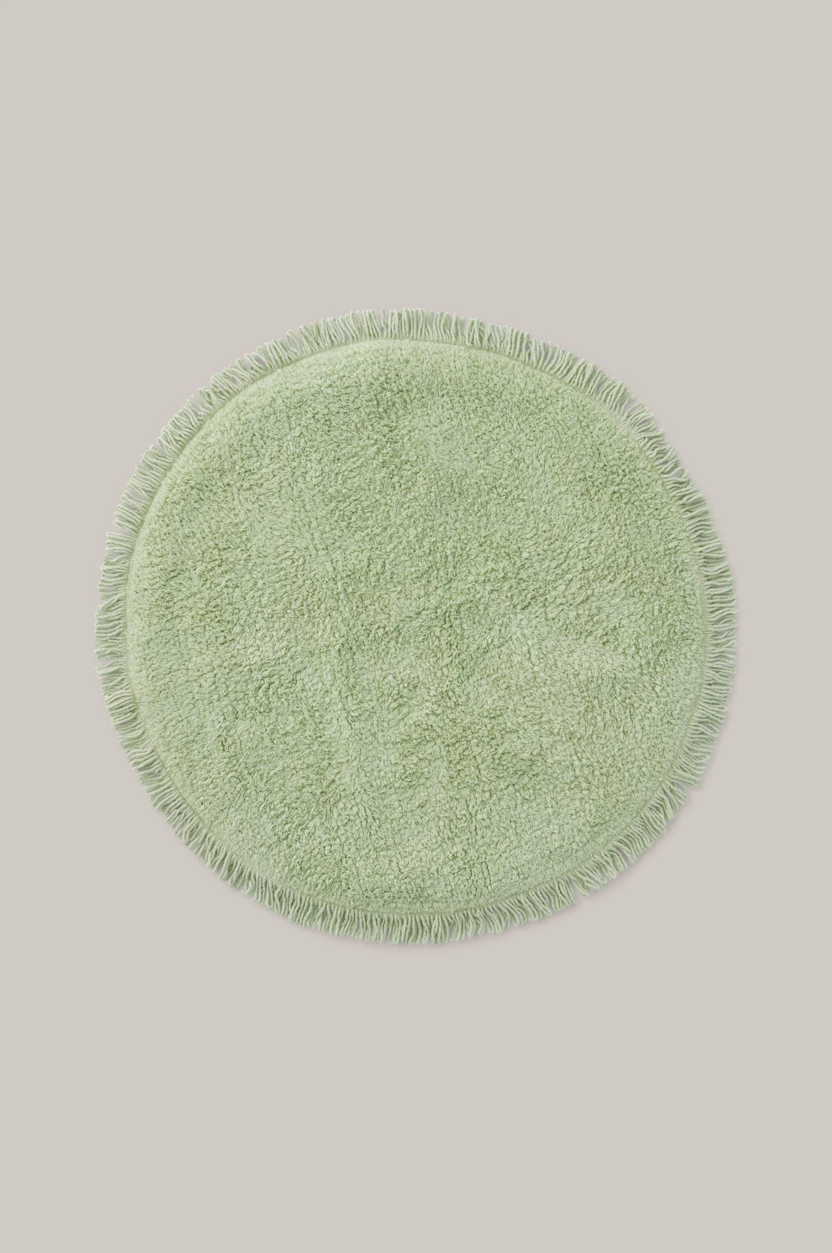 Rund, tuftad badrumsmatta med fransar runt om. Diameter 70 cm.